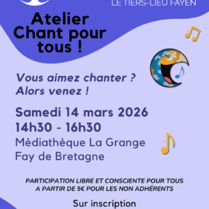 Cet atelier couture, toujours proposé par Dominique, sera spécialement consacré à la fabrication de protections hygiéniques réutilisables, en écho au spectacle Chattologie, programmé à Fay de Bretagne dans le cadre du Festival Hors Saison (mercredi 11 mars à 20h, salle Denise Grey). Tarifs : 5 € pour les adhérents / 8 € pour les non-adhérents… Lire la suite »Atelier Chant pour Tous